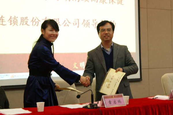 章启瑞总经理介绍了颐而康公司的基本情况,该公司坚持“为人类健康服务”的宗旨,是以医疗保健按摩服务为主,集推拿手法、保健品、保健器械、健康饮食等的研究、开发、培训、鉴定、咨询和服务于一体的多元化发展企业。章总充分肯定了我校为社会培养杰出人才做出的重大贡献,并表示希望与学校保持长期友好合作关系。她指出,此番设立“杰出学子” 奖项一方面可以鼓舞、支持在校学生的发展,另一方面也希望能吸引更多优秀学子加入颐而康公司,为百姓健康服务。