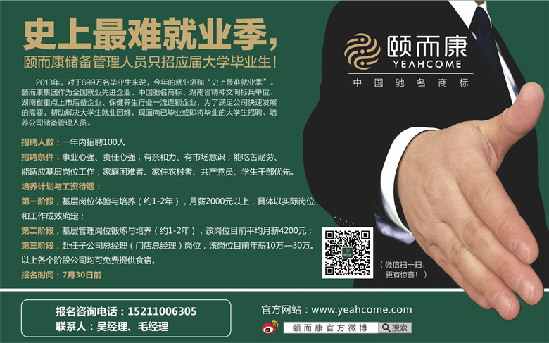 2013年,对于699万名毕业生来说,今年的就业堪称“史上最难就业季”。颐而康集团作为全国就业先进企业、中国驰名商标、湖南省精神文明标兵单位、湖南省重点上市后备企业、保健养生行业一流连锁企业,为了满足公司快速发展的需要,帮助解决大学生就业困难,现面向已毕业或即将毕业的大学生招聘、培养公司储备管理人员。