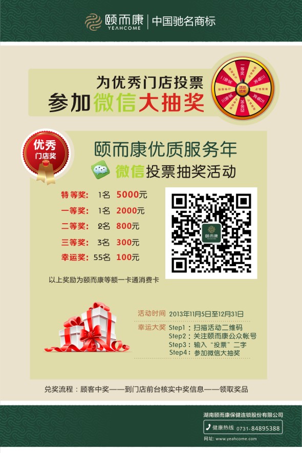 此次颐而康优质服务年“优秀门店奖”微信投票抽奖活动正是颐而康感谢广大顾客、回馈社会的一次新探索。此次微信投票抽奖活动旨在通过移动互联网这种新兴的即时沟通工具,让广大顾客能通过微网站、微信在最短时间内更好地了解颐而康,从而更好地享受颐而康服务。此次活动拟于2013年11月5日正式启动,将持续到12月31日。在此期间颐而康将为顾客朋友们送出特等奖、一、二、三等奖及幸运奖共计62项,价值一万五千元的奖品。颐而康顾客朋友均可通过门店展示的活动二维码、公司网站活动通知等方式添加颐而康官方微信,参加到此次投票抽奖活动中来!