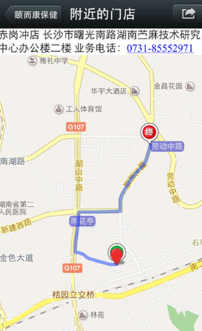 2、微网站将根据您的手机定位您所在位置,通过智能定位寻找到离您最近的颐而康门店,并在自动调出的百度地图上进行指示标记,同时还将为您规划最方便的路线前往。(如下图所示)