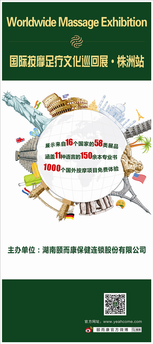 颐而康的小伙伴们~国际按摩足疗文化巡回展全面启动啦!首站株洲,诚邀您前来观展。本届展览主要展出颐而康集团十多年来搜集的来自16个国家的58类展品,涵盖11种语言的150余本按摩足疗方面专业书刊,还有国外按摩项目等您来免费体验哦!快带上您的亲朋好友一起来颐而康株洲庐山路华晨旗舰店吧! 展览时间:2013年11月27日起 11:00 -- 22:00 展览地点:湖南省株洲市天元区庐山路与珠江北路交汇处华晨国际2F
