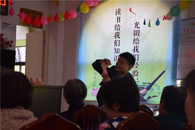 讲座中,徐老师穿插介绍了食疗调理肠胃的方法。经过近2小时的公益讲座后,湖南颐而康职业技术学校的义工团队还精心设置了一些针对讲座内容的提问环节,并准备了精心的小礼物。答问的环节中,我们惊讶的发现,很多老人朋友们已经能够流畅的讲出所学的艾灸、按摩的知识,并能快速在自己身上找出相应的穴位。