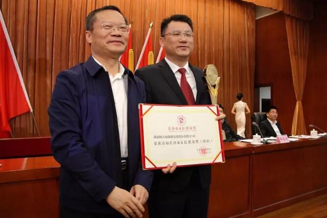 会议上,胡忠雄为湖南粮食集团有限责任公司、湖南颐而康保健连锁股份有限公司、金杯电工股份有限公司、加加食品集团股份有限公司、九芝堂股份有限公司、澳优乳业(中国)有限公司董事长颜卫彬、山河智能装备股份有限公司总经理助理兼商务总监黄志雄颁发了首届长沙市市长质量奖奖杯和证书。